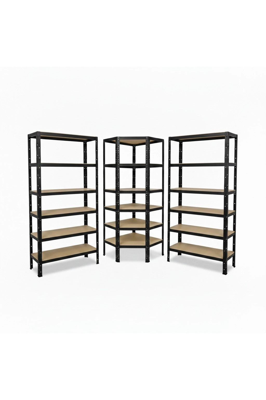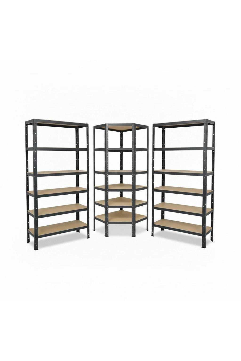 Kompletní regálová sestava za zvýhodněnou cenu: sleva až -10 %. Regály jsou bezšroubové, s dělenou stojinou, které můžete sestavit i jako dva menší regálové komplety o výšce 90 cm. Regály mají police s HDF deskami, což jsou hladké dřevěné desky, které jsou pro údržbu a čištění srovnatelné s kovovými deskami a navíc se tolik neprohýbají a nenavlhnou jako klasické dřevotřískové desky.