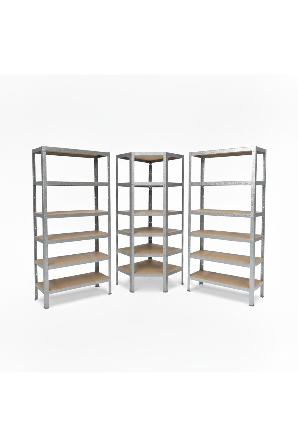 Kompletní regálová sestava za zvýhodněnou cenu: sleva až -7 %. Regály jsou bezšroubové, s dělenou stojinou, které můžete sestavit i jako dva menší regálové komplety o výšce 100 cm. Regály mají police s HDF deskami, což jsou hladké dřevěné desky, které jsou pro údržbu a čištění srovnatelné s kovovými deskami a navíc se tolik neprohýbají a nenavlhnou jako klasické dřevotřískové desky.