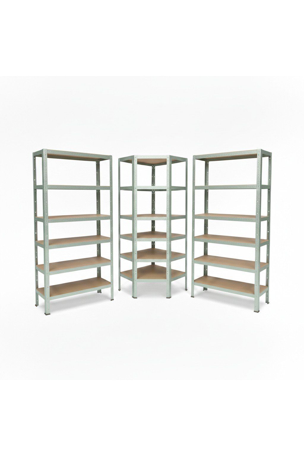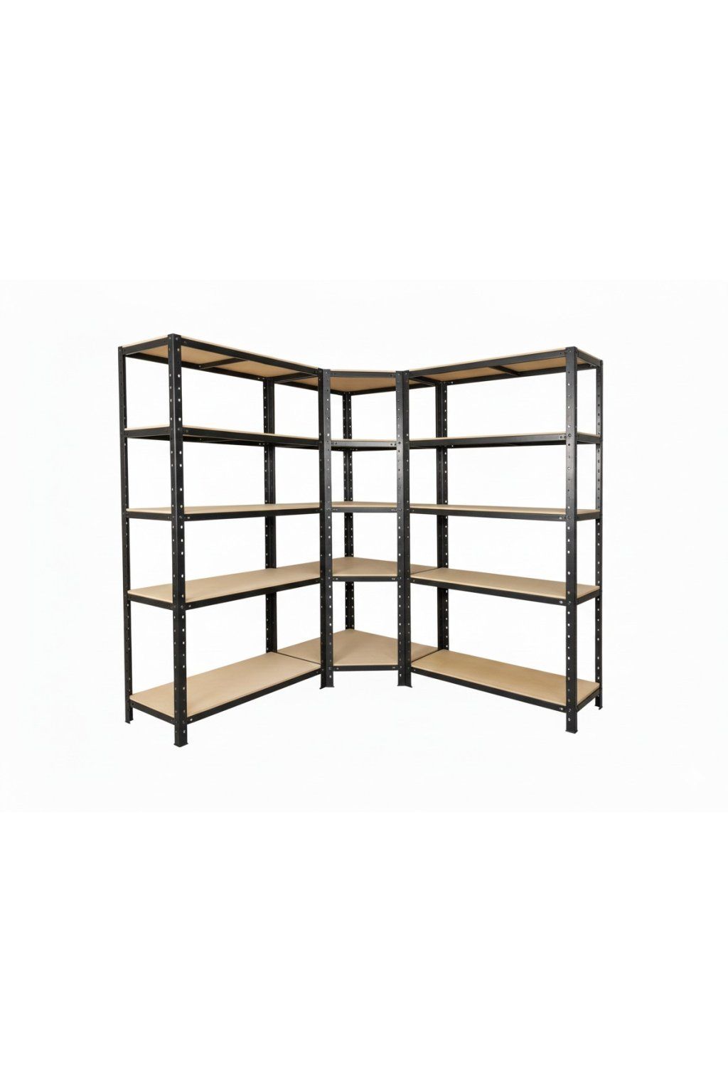 Regálový systém 200x170x60 cm: 1 rohový regál 200x90x60 cm + 2 policové regály 200x80x60 cm jako kompletní sestava umožňující vyplnit i místa v rozích pro skladování. 15 nebo 18 polic. Nosnost až 175 kg/polici. Regály jsou vybaveny HDF dřevěnými deskami. Vyrobeno v Německu. Doprava v ČR zdarma.