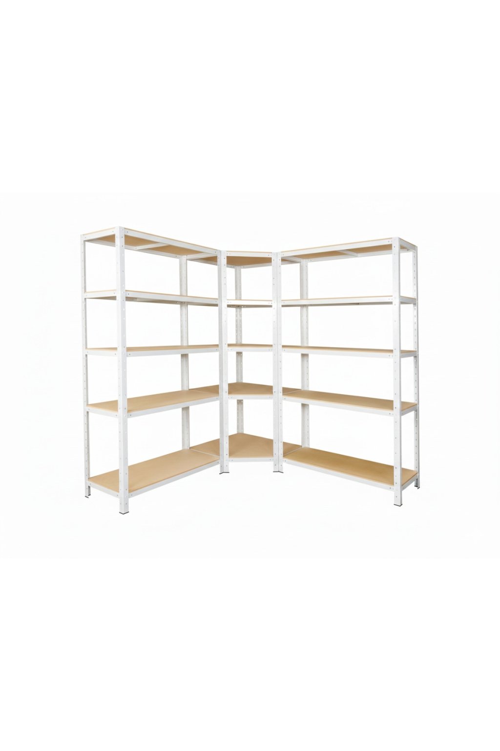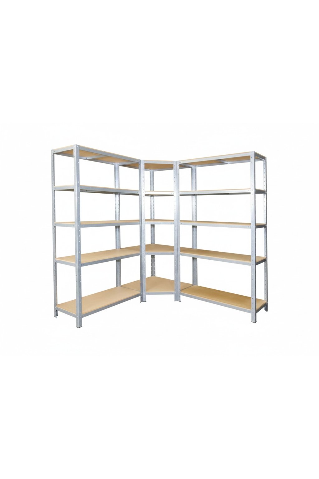 Regálový systém 200x180x60 cm: 1 rohový regál 200x90x60 cm + 2 policové regály 200x90x60 cm jako kompletní sestava umožňující vyplnit i místa v rozích pro skladování. 15 nebo 18 polic. Nosnost až 175 kg/polici. Regály jsou vybaveny HDF dřevěnými deskami. Vyrobeno v Německu. Doprava v ČR zdarma.
